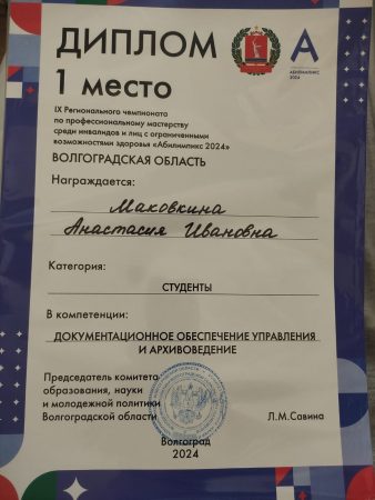 Поздравляем победителя чемпионата профессионального мастерства Абилимпикс 2024 по компетенции Документационное обеспечение управления и архивоведение Маковкину А.И. (гр. ВТВ 112) и наставника Науменко Е.В.