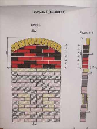 Выполнение модулей Г и Д: нужно распилить кирпич пополам, и половинку по диагонали, вверх арки Модуля Г, идёт с половинок кирпича с отступом 10 мм.