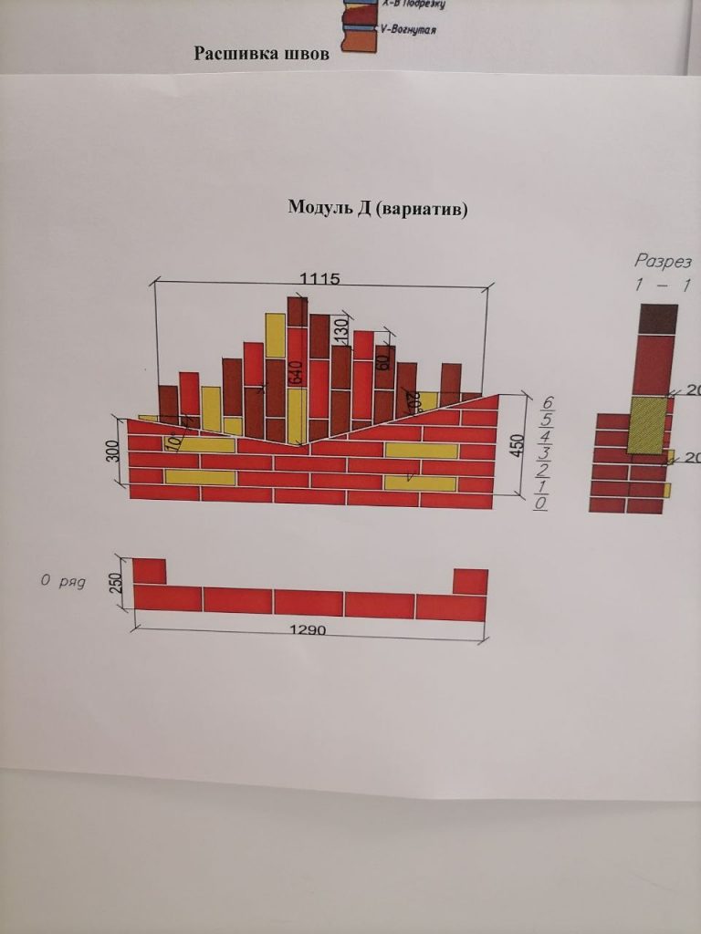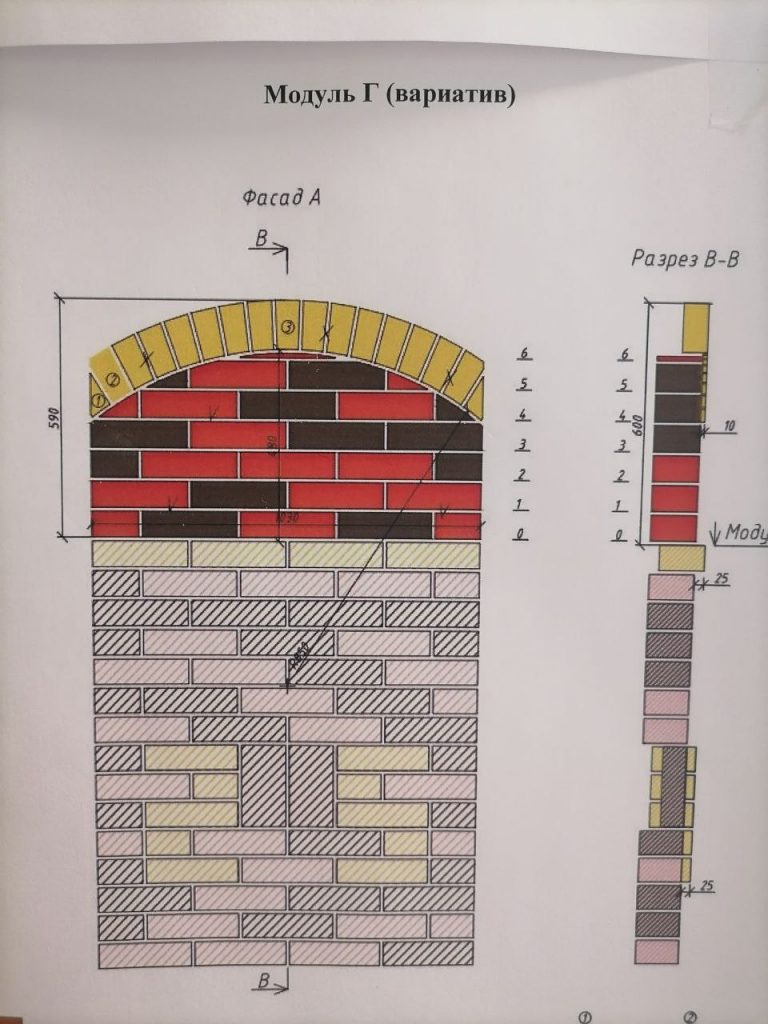 Выполнение модулей Г и Д: нужно распилить кирпич пополам, и половинку по диагонали, вверх арки Модуля Г, идёт с половинок кирпича с отступом 10 мм.