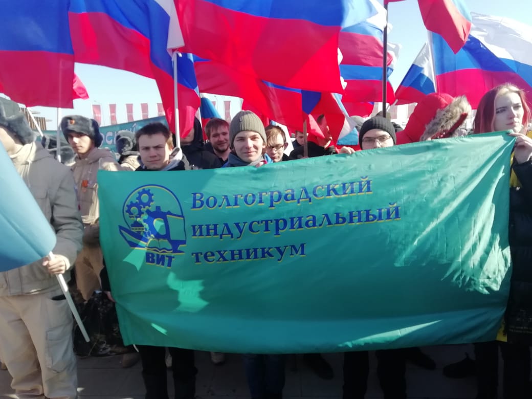 Волгоградский индустриальный техникум принял участие в митинг-концерте «Крымская весна» в парке «Россия – моя история». На сцене выступили ансамбль ГУ МВД, ансамбль казачьей песни «Лазоревый цветок», солисты “Царицынской оперы” и Волгоградской филармонии и тд. Ребята попробовали блюда полевой кухни. Площадь перед музеем «Россия — моя история» выглядела как никогда живописно. Собираясь на митинг, студенты нашего техникума взяли с собой не только хорошее настроение, но и флаги. Отметить восьмилетие воссоединения России и Крыма пришли студенты всех учебных заведений города. От молодежи также присутствовали волонтеры Победы. |