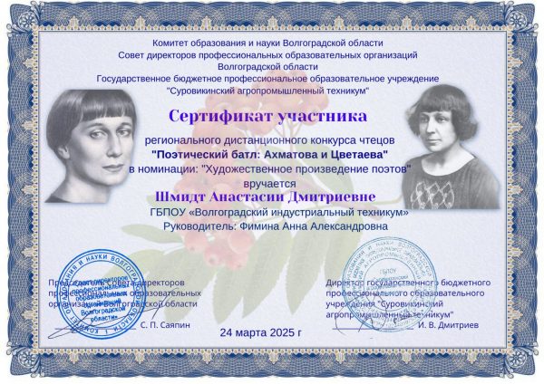 На базе ГБПОУ «Суровикинский агропромышленный техникум» в дистанционном формате состоялся региональный конкурс чтецов «Поэтический батл: Ахматова и Цветаева», в котором приняла участие Шмидт Анастасия, обучающаяся ГБПОУ ВИТ, гр. ИСиП -124 (отв. преподаватель – Фимина А.А.)