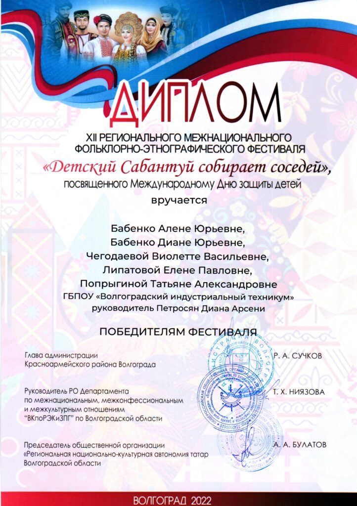 ГБПОУ «Волгоградский индустриальный техникум» принял участие в данном мероприятии, и наши студентки первого курса достойно представили свои умения в кулинарном искусстве. Поздравляем с дипломом победителя фестиваля.